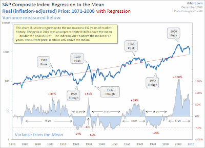 This wonderful chart below (courtesy of Doug Short) shows that not a single time in history the stock market did not mean-revert (trend mean), after a sharp decline. A lot of people argue ‘this time is different’ because of the Fed’s extraordinary actions and Obama’s big stimulus plan. I wonder how in the past the policy makers had done anything different: didn’t they also try to stimulate, but with no avail???